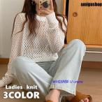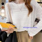 ニット レディース トップス 透かし編み 網 サマーニット クルーネック 長袖 リブ レイヤード ハイウエスト プルオーバー おしゃれ かわ