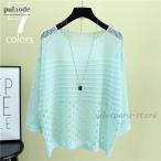 サマーニット プルオーバー 透かし編み メッシュ レディース トップス 編み時切替 ラウンドネック 7分袖 春 夏 薄手 重ね着 無地 ホワイト ブラ