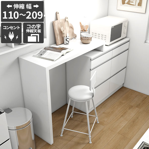 キッチンカウンター 食器棚 レンジ台 キッチン収納 おしゃれ 台所 伸縮テーブル 作業台 カウンターテーブル レンジラック 電子レンジ台 大型レンジ台対応 大容量 キャスターなし 鏡面 ホワイト 高級感 【RDW-1203/PlusOneコの字/nail/約幅110〜209cm奥行44cm高さ94cm】 ☆