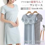 パジャマ ルームウェア カップ付き ワンピース レディース 綿 半袖 ボーダー 部屋着 膝下 ミモレ丈 大きいサイズ 透けない マタニティ