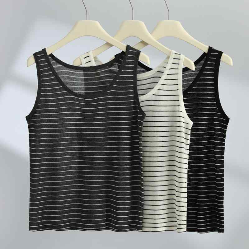 女性用 テンセル リネン ラウンドネック ベスト 涼しく 通気性 ストライプ コントラスト ニット サスペンダー ノースリーブインナー レイヤリング シャツ