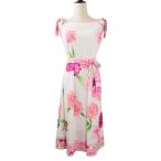 未使用 LEONARD レオナール フラワープリント カンカンストレッチ ショルダーリボン ベルテッドワンピース サイズ38 ピンク レディース 古着 中古