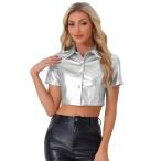 uxcell Allegra K クロップトップ ジャケット ブラウス PU レザー 半袖 ボタンダウン シャツ ブラウス レディース シルバー M