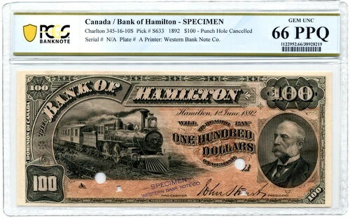 1892年 100ドル カナダ、ハミルトン銀行、見本 - 宝石 未流通、PCGS UNC66 PPQ