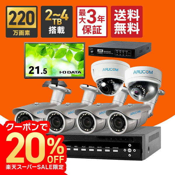 【SS限定20%OFF&P10倍】送料無料 2年保証 防犯カメラ 屋外 セット 1台〜4台 220万画素 有線 防犯カメラセット AHD 高画質 ワンケーブル 録画機 ハードディスク 2TB レコーダー 屋内 室内 ズーム 夜間 防水 広角 録画 動体検知 家庭用 業務用 監視カメラ SET725