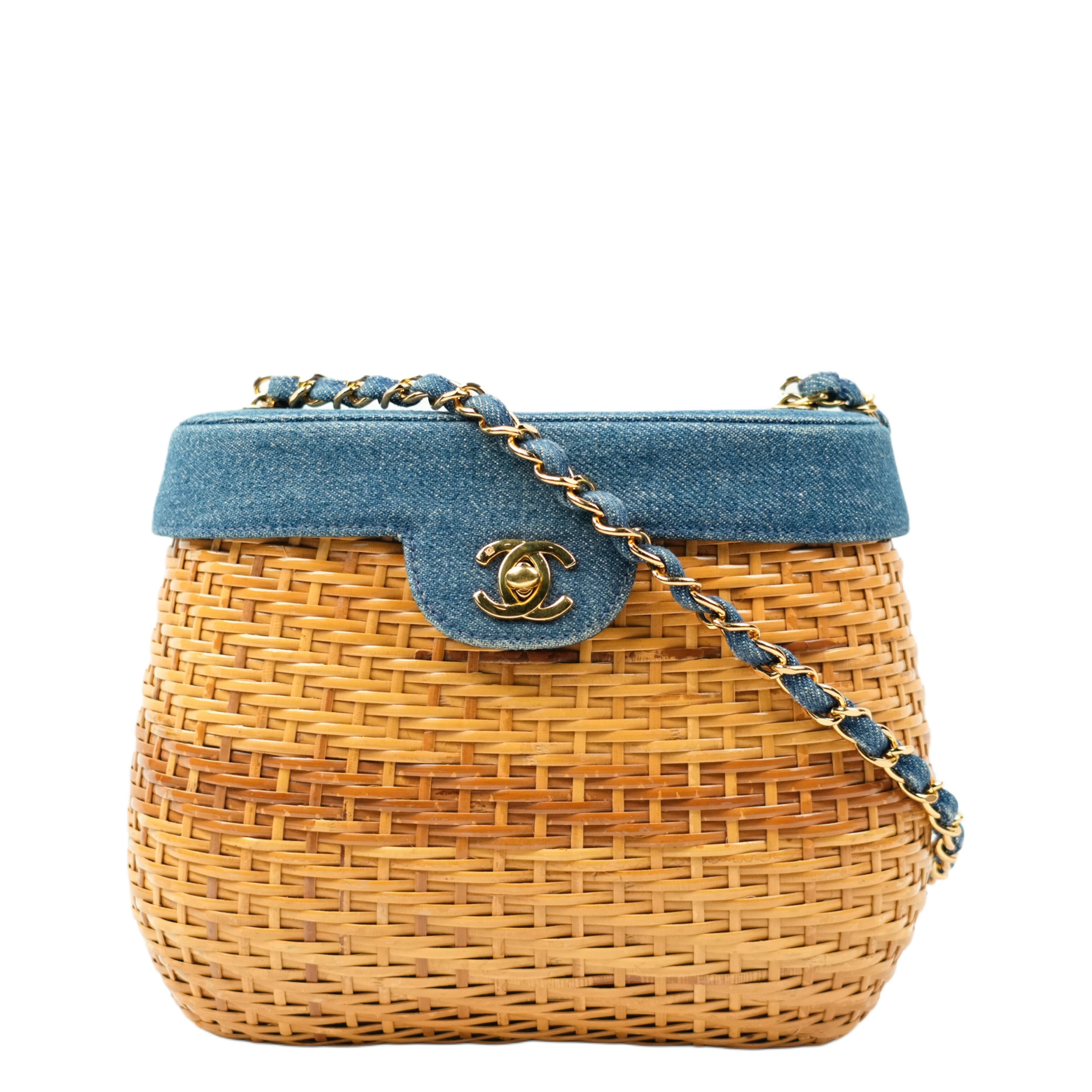 【中古・VINTAGE】CHANEL シャネル 1997-1999 ココマーク チェーン ストロー デニム カゴバッグ ショルダーバッグ ブルー ベージュ ヴィンテージ 1997-1999 Coco Mark Chain Straw Denim Basket