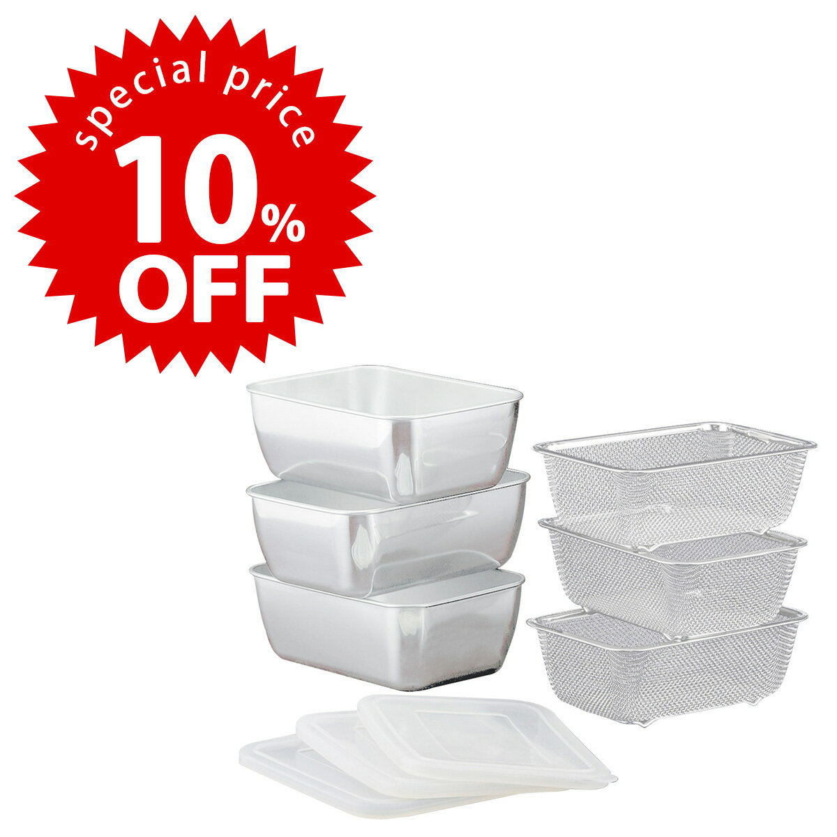 【 スーパーセール 期間限定 10%OFF 】シリコン フタ付 角バット ザル 各3個ずつ 9点セット日本製 ステンレス 水切り 下ごしらえバットセット ステンレスざる 調理バット キッチンバット深型 料理上手 角型 小分け バット時短 下村企販 燕三条 省スペース