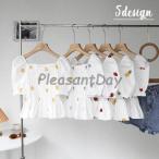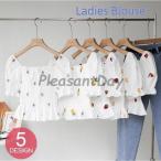 ブラウス 半袖 レディース 女性 トップス カットソー スクエアネック パフスリーブ 袖ゴム ギャザー 刺繍入り 花 フラワー イチゴ パイナップル