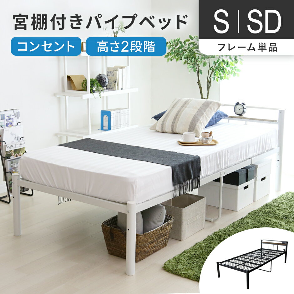 5日+5% ベッド シングル 収納 おしゃれ パイプベッド ベッドフレーム シングルベッド 耐荷重300kg 宮付き 高さ調節 コンセント付 木製 スチール アイアン