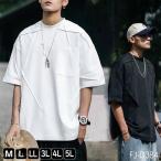 メンズTシャツ デザイン パッチワーク風 切り替え シャツ 半袖 カットソー オーバーサイズ 半袖tシャツ Uネック 透けない サイドスリット 無地