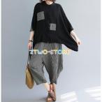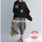 上下セット レディース ツーピース シャツ 五分袖 立ち襟 パッチワーク サルエルパンツ クロップド丈 縦ストライプ柄 ゴムウエスト モノトーン ラージサイズ