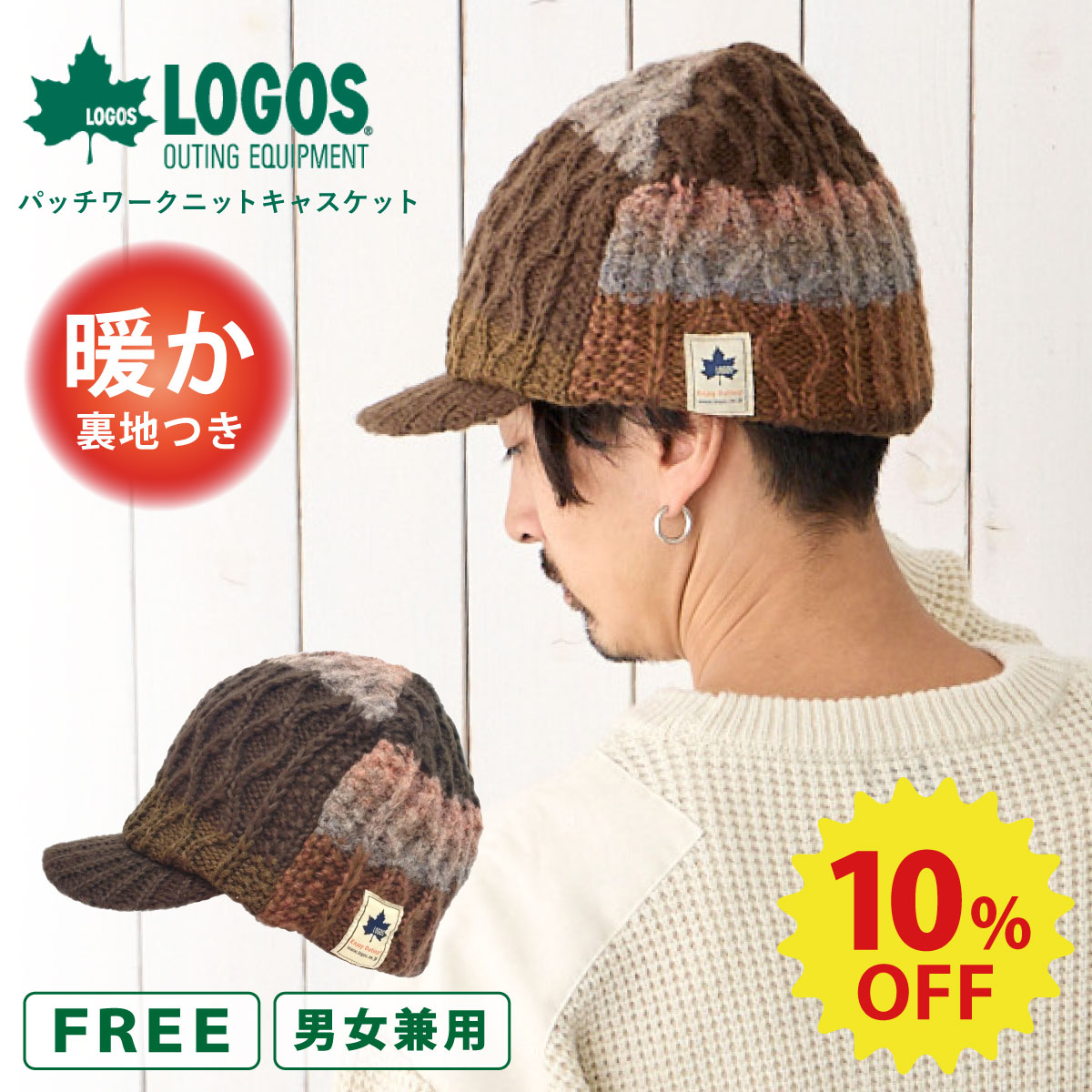 【エントリーでポイント10倍】【10%OFF】LOGOS つば付 ニット帽 キャスケット 耳まで暖かい パッチワーク風 あったか フリース裏地 深め BIG キャップ 57cm-62cm ケーブル編み knit-1720 正規品 メンズ レディース 大きい 防寒 男女兼用 プレゼント 即納【メール便送料無料】