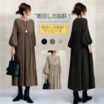 プリーツワンピース 長袖 レディース 春服 パフスリーブ 丸首 ロングワンピース 大人きれいめエレガント リゾート 黒 ブラック 着回し40代 春秋 九分丈袖 ミモレ