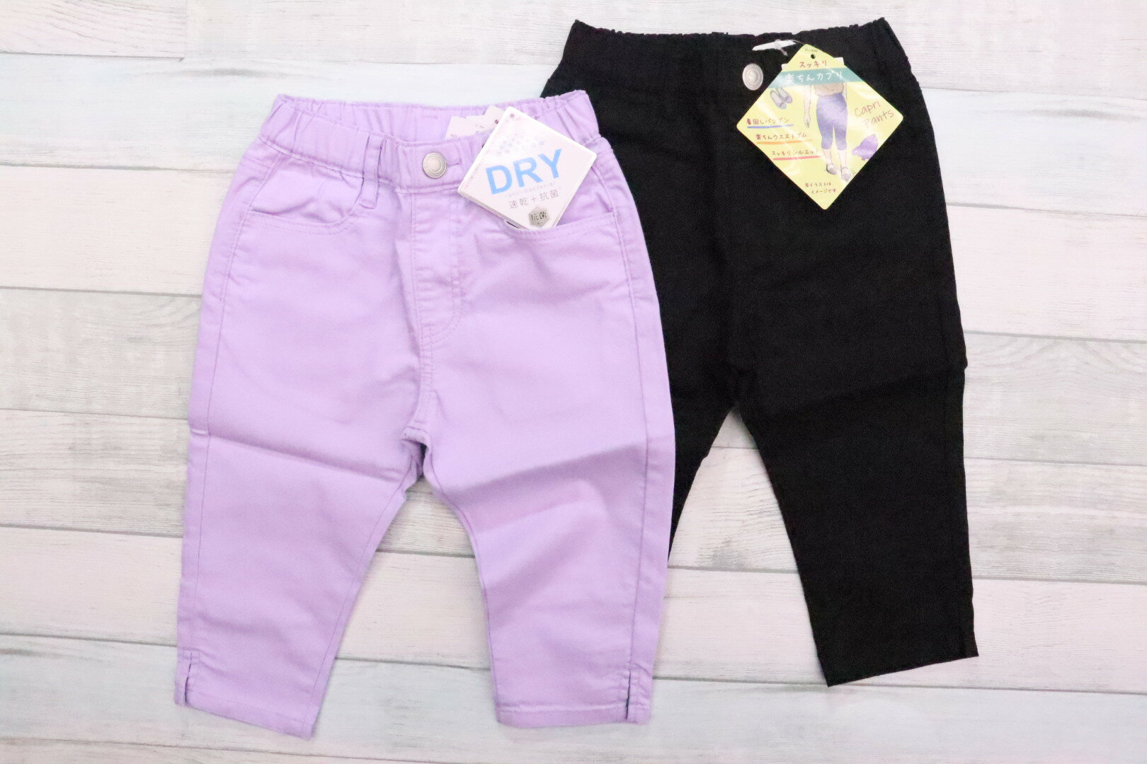カプリ パンツ 110cm 120cm 130cm 無地 抗菌 速乾 シンプル ズボン ウエストゴム デニム ブラック パープル 子供服 女の子 キッズ スッキリ 楽ちん 通園 通学 DRY かわいい ラベンダー 黒 サイドスリット ボトム