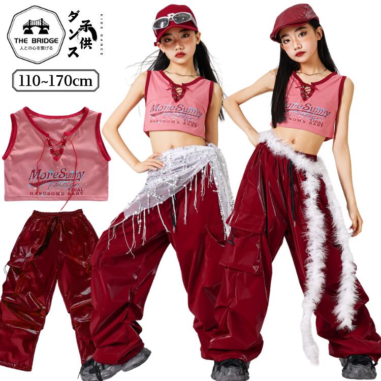 赤 子供ダンス 女の子 ジャズダンス衣装 袖なし そ出しトップス レザー パンツ ピップカバー スパンコール タンクトップ カーゴ パンツ キッズダンス k-pop衣装 hiphop ストリート 演出服 練習着 セットアップ ダンスウェア かっこいい ステージ衣装 110-170