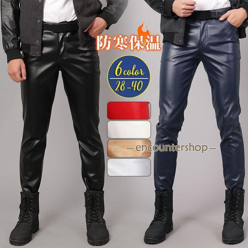 【期間限定10%OFF】革パンツ メンズ レザーパンツ 革パン ストレッチ 演出 微起毛 防寒 フェイクレザー 無地 大きいサイズ ライダースパンツ 細身 美脚 秋冬