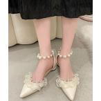 パンプス ポインテッドトゥ フリル パール アンクルストラップ パンプス