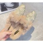 ファー付き ミュール サボサンダル パンプス レディース 幅広 フラットヒール あったか ファースリッパ 秋冬 スリッパ 外履き 事務所 お仕事 バブーシュ
