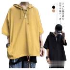 半袖 パーカー メンズ BIGサイズ フード付き ゆったり 無地 夏服 プルオーバー Tシャツ トップス 大きいサイズ 5分袖 韓国ファッション