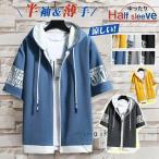 パーカー メンズ 半袖 夏 涼しい 切り替え ジップアップ 前開き フード 袖文字 五分袖 トップス スッキリシルエット 大人カジュアル 半袖パーカー