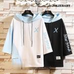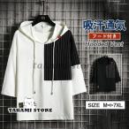 半袖パーカー メンズ 七分袖 7分袖 薄手 フード 英語柄 夏服 切り替え 接触冷感 おしゃれ カジュアル