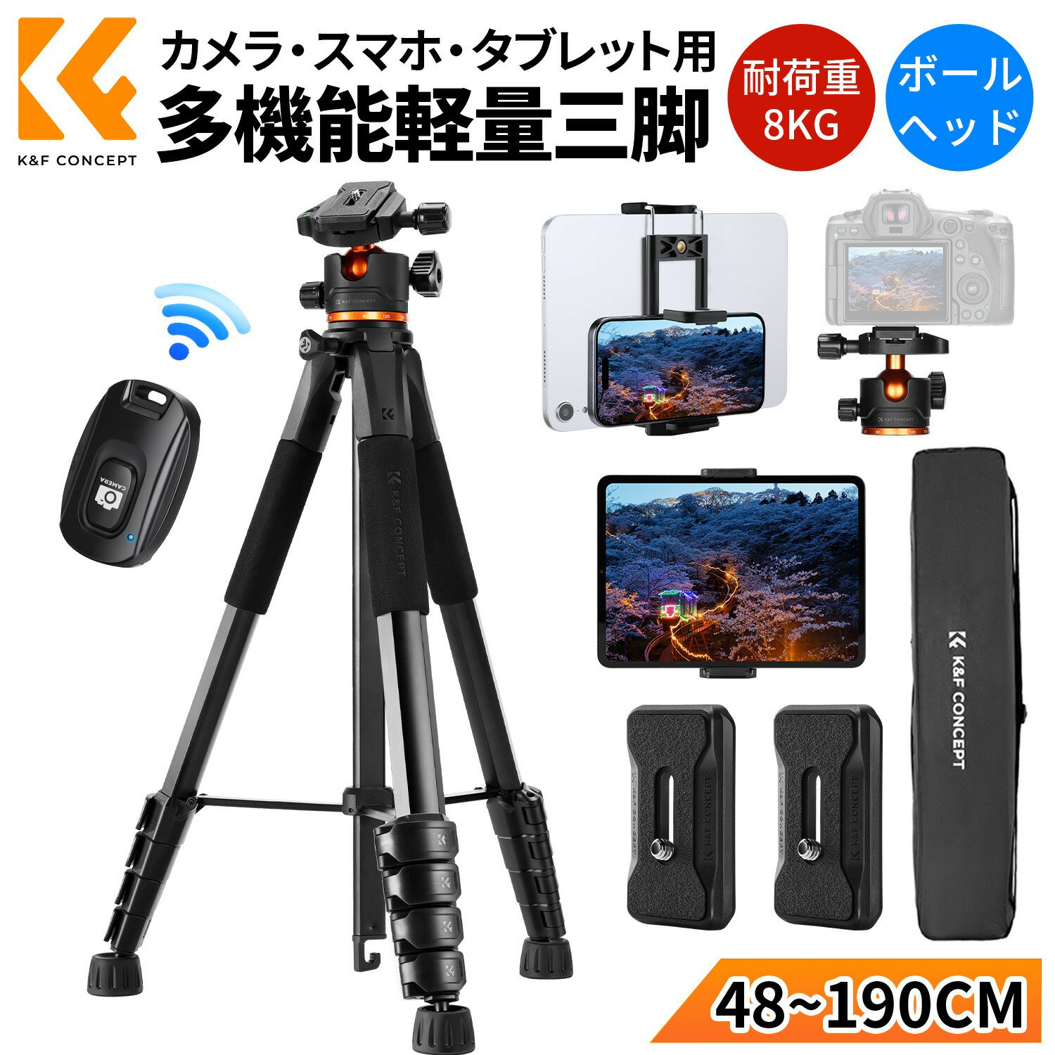 \BLACK FRIDAY+P10倍!! /【ボール雲台★48~190cm】カメラ三脚 カメラ スマホ 三脚 1.3kg 軽量 コンパクト ビデオカメラ トラベル三脚 5段階伸縮 360°回転 耐荷重8KG ポータブル スリム 持ち運び リモコン付き 三脚 一眼レフ用 タブレット/iPhone/Android/カメラ対応