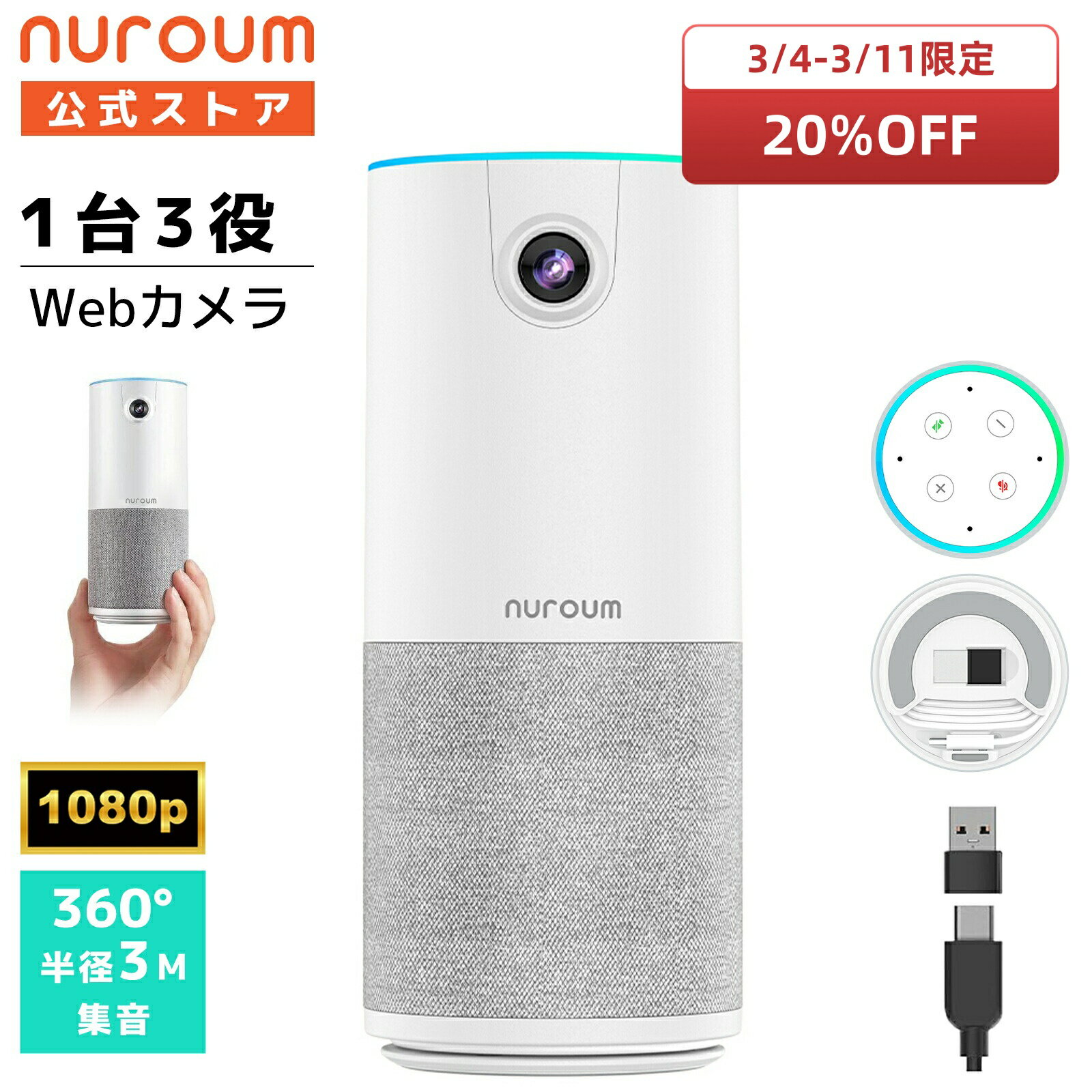 【20%OFF&P5倍★3/11迄】webカメラ マイク スピーカー 一体型 小型 1台3役 web会議 集音マイク 90°広角 1080P 30fps 200万画素 半径3m集音 四つマイク内蔵 プラグ&プレイ コンパクト ウェブカメラ ビデオ会議 ミーティング 会議室 1年保証 送料無料 Nuroum C10