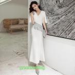 カラードレス パーティードレス イブニングドレス マーメイドドレス マキシ丈 ホワイト スリット袖 ビーズフリンジ フォーマルドレス カクテルドレス イベント