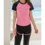 水着 レディースフィットネス水着体型カバー ラッシュガード+レイヤード風ショートパンツ 3点セット レディース