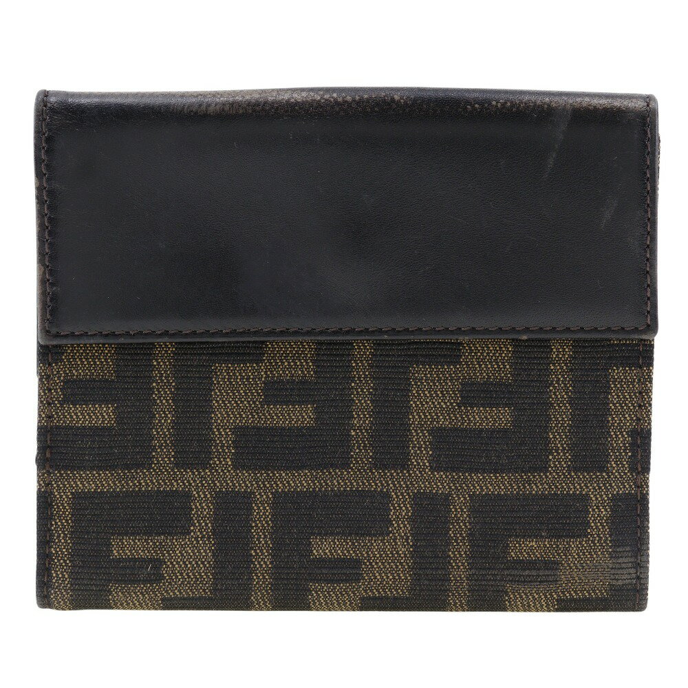フェンディ 二つ折り財布 ズッカ ブラウン ジャガードキャンバス レザー ダークブラウン 中古 コンパクトウォレット FFロゴ オールド ヴィンテージ レディース FENDI