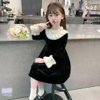フォーマルドレス キッズ 子供服 ドレスワンピース 膝丈ワンピース 黒いワンピース 女の子 丸首 長袖 発表会 バースデー KWGA088(110-150)