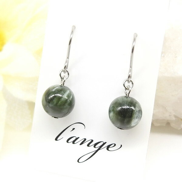 純チタンピアス セラフィナイト 8mm玉 天然石 グリーン 金属アレルギー対応 レディース フックピアス シルバーカラー