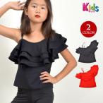 子供 キッズ フラメンコ衣装 ダンストップス 無地 3段フリル ボリューム ワンショルダー 肩見せ 袖なし 肩紐調節 ガールズ 伸縮素材 DK97192 [M便 2/3]