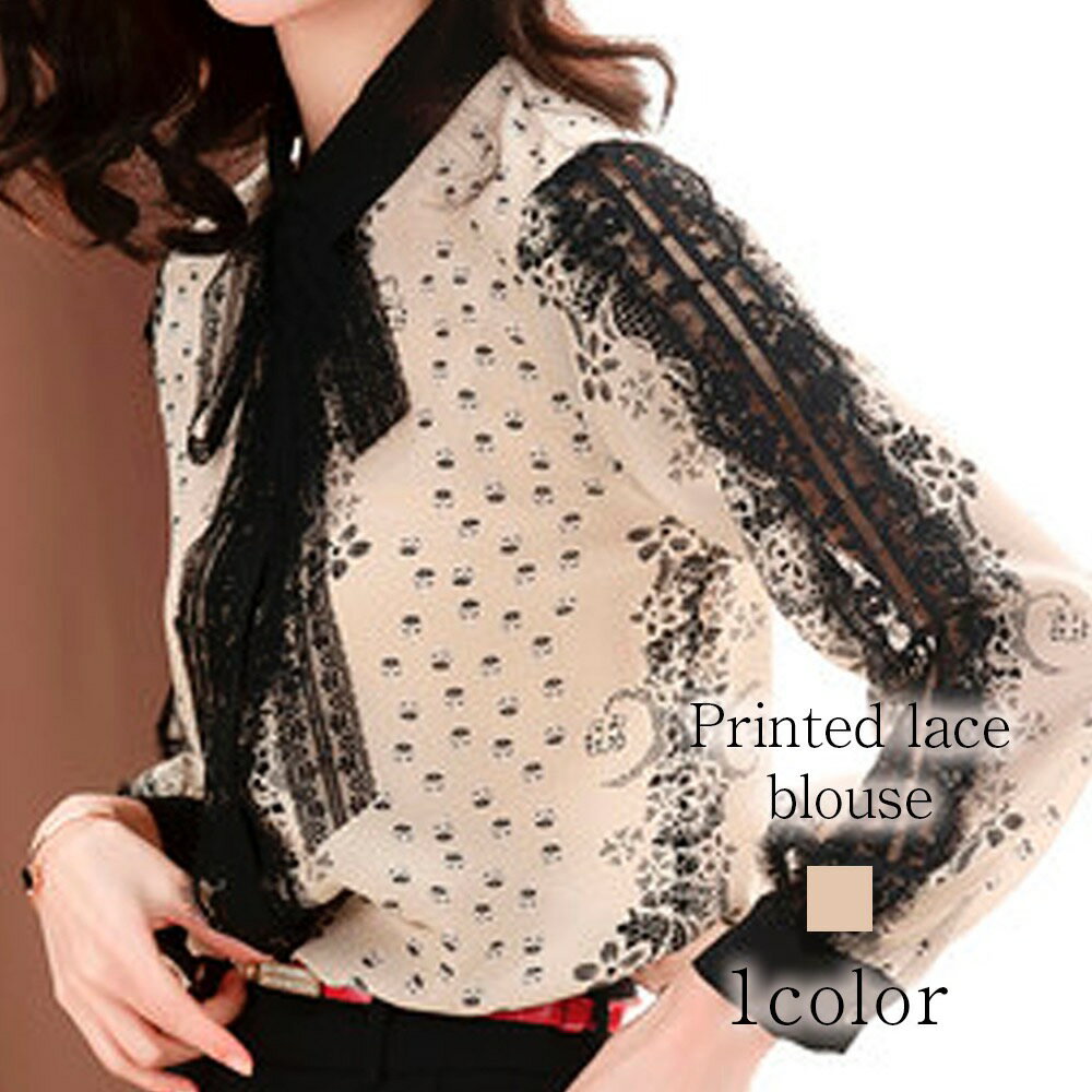 【\クーポン利用で20%OFF!/】 ブラウス レディース プリントレースブラウス 高品質 長袖 人気 フォーマル 白 事務服 厚手 黒 オフィス レース シフォン フリル おしゃれ ボウタイ Tシャツ カジュアル ブランド きれいめ ノーアイロン 秋 冬 春 カットソー