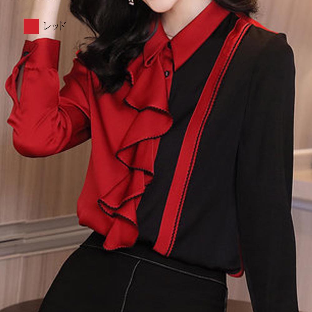 【\クーポン利用で20%OFF!/】 ブラウス レディース バイカラーフリルブラウス フリル ブランド きれいめ スーツ ワンピース 長袖 カットソー 冬 Tシャツ ノーアイロン 事務服 高品質 オフィス レース 黒 おしゃれ ボウタイ 春 シャツ シフォン カジュアル 安い
