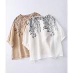 送料無料 トップス ブラウス 半袖 パフスリーブ ぽわん袖 ラウンドネック リネン 麻 刺繍 花 フラワー ボタニカル スモック風 ホワイト「cawaii french」
