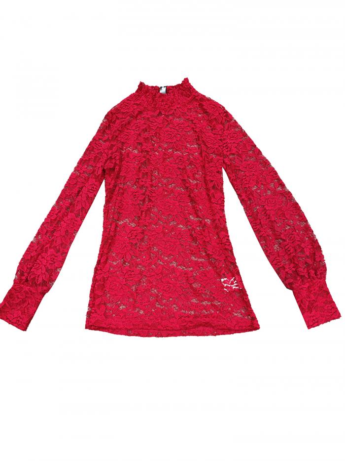 【期間限定10%OFF】Allegra K 花柄ブラウス 長袖 トップス スモック ハイネック メッシュ レース レディース クリムゾン M