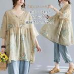 チュニックブラウス リネン チュニック レディース 刺繍ブラウス 七分袖 チュニック 夏 プルオーバー ノーカラー 綿麻風 ナチュラル トップス リネン混 森ガール