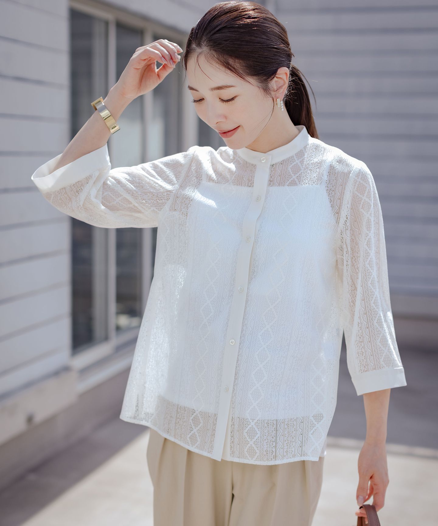 ブラウス レディース トップス 春 夏 半袖 総レース スカラップ スタンドカラー 透け感 シアー 涼しい 裏地付き 細見え効果 きれいめ ゆったり 大きいサイズ 体型カバー 二の腕カバー 着回し クラシカル※メール便可※【10】