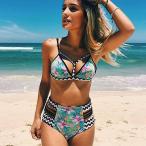 女性花ハイウエストプッシュアップビキニセットパッド入りブラストラップビーチウェア水着