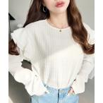tシャツ ブロックジャガード袖フリルロングTシャツ レディース