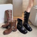 レディース ローヒール エンジニアブーツ 滑り止め サイドジッパー 履きやすい 歩きやすい ジョッキーブーツ ロングブーツ 秋冬 黒 4.5cm太ヒール ベルト 厚底