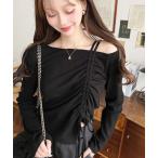 tシャツ ワンショルドロストリボン長袖リブカットソートップス レディース