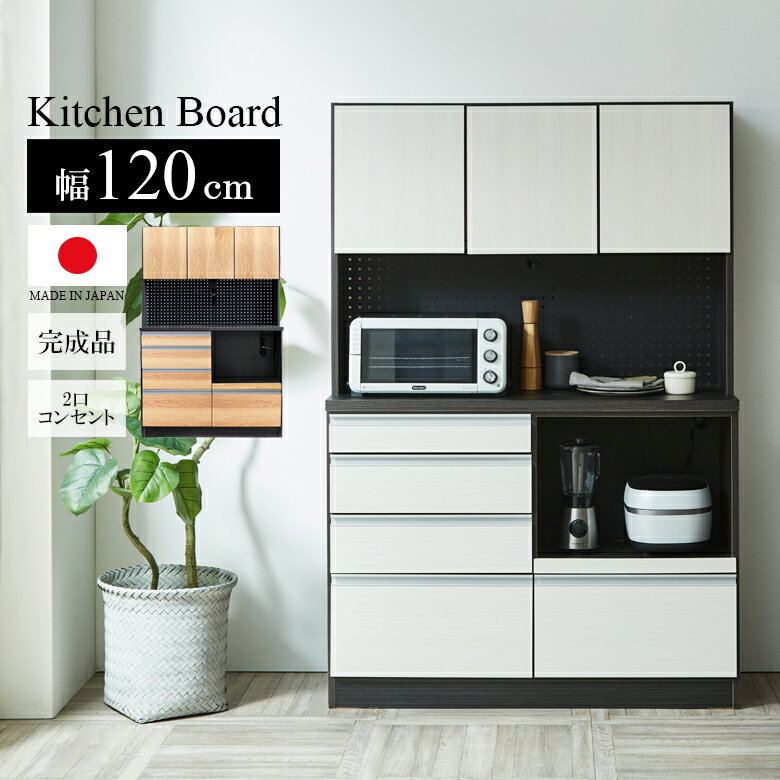 【全商品に使える10%offクーポンあり!!】 食器棚 120cm 完成品 キッチンボード 幅120cm おしゃれ モダン 収納 キッチン収納 引出し 引き出し収納 コンセント付き スライドレール フルスライド MDF 強化シート プリント紙化粧繊維板 国産 日本製