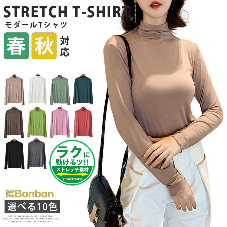 【最大20%OFFクーポン】 トップス レディース 長袖 tシャツ トップスtシャツ モックネック プルオーバー 可愛い オシャレ 春 秋 モダール素材 滑らかな肌触り 優しい着心地 吸湿性 放湿性 高弾力 柔軟 素肌感覚 無地 tシャツ カットソー アウター 重ね着 通勤 旅行