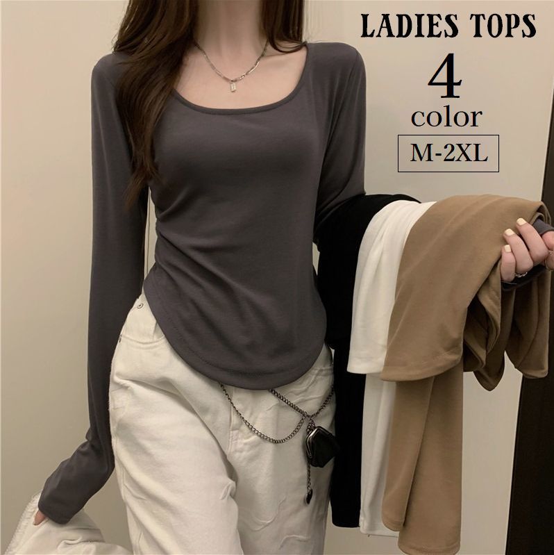 送料無料 カットソー 長袖 レディース トップス Uネック 薄手 プルオーバー 無地 ソリッドカラー ラウンドカット 萌え袖 婦人服 女性用 大きいサイズあり 着回し カジュアル ラフ 普段着 デイリー M L XL 2XL
