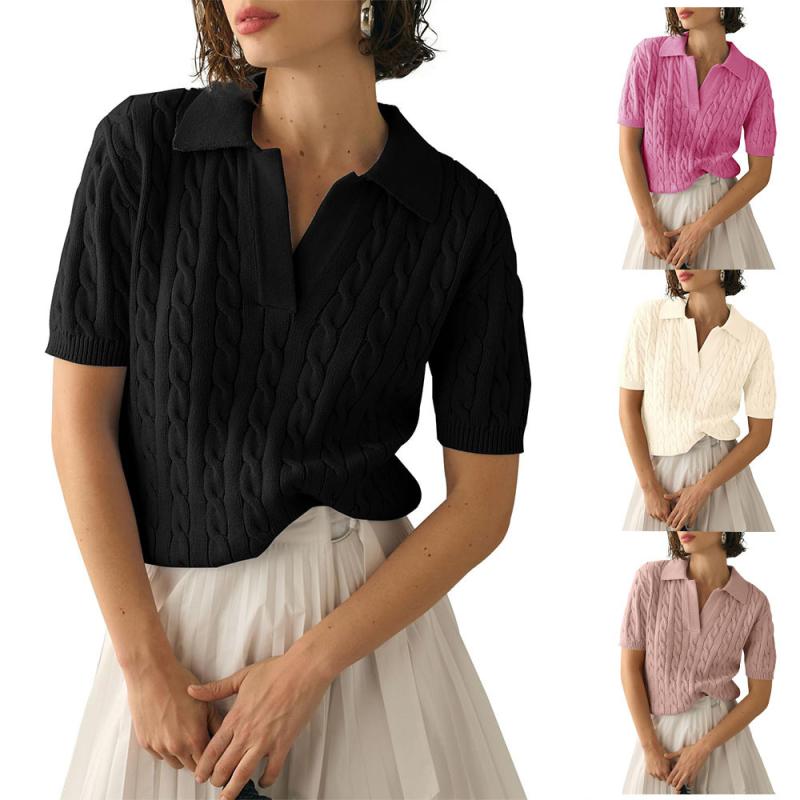 ニット レディース 春夏 半袖 Vネック トップス プルオーバー ケーブル編み 粘性繊維 接触冷感 無地 ブラック ピンク系 ベージュ S M L XL 普段使い2