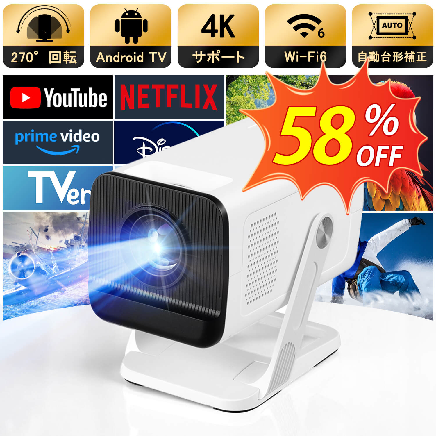 \58%OFF!P10倍/プロジェクター 家庭用 Android OS搭載・自動台形補正・短焦点設計 270°回転 180ANSI 1080P 4K対応 プロジェクター 小型 Wi-Fi6 Bluetooth5.4 スピーカー内蔵 ホームプロジェクター 静音 スマホ/ノートパソコン/USB/Switch対応