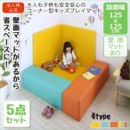 (タイムセール中) キッズコーナー 5点セット フロアマット1枚+スツール2枚+壁面マット2枚 125×125 安全安心コーナー型キッズプレイマット