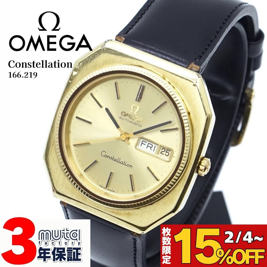 \枚数限定15%OFF配布中/オメガ コンステレーション Ref.166.219 メンズ YG 自動巻き OH 1年保証 ビンテージ 腕時計 時計 ギフト 中古 OMEGA Constellation アンティークオメガ ヴィンテージ時計 ウォッチ 男性 8角形 大型 高級 おしゃれ ゴールド W019